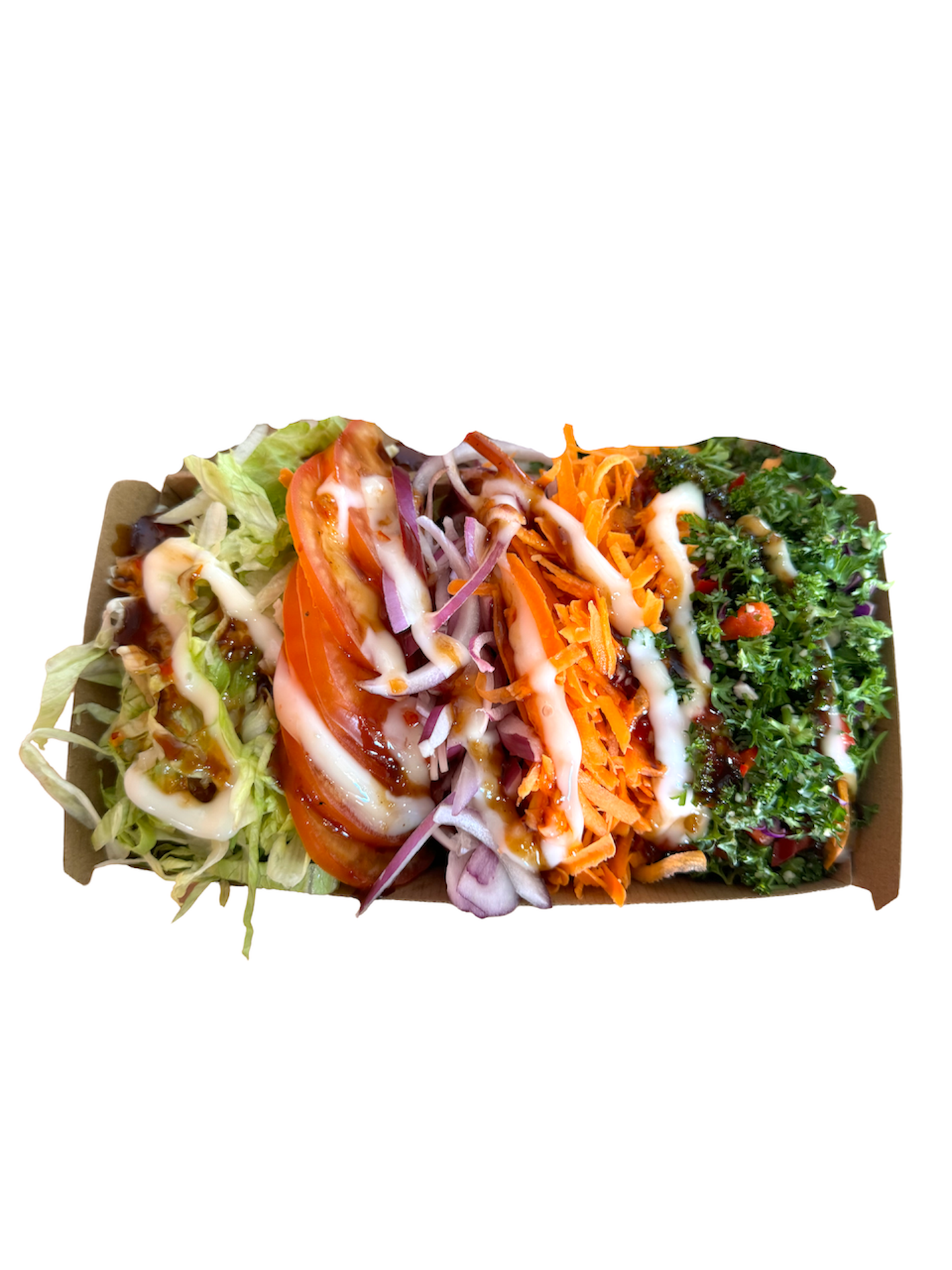 Our Salad Kebab is served with Lettuce, Tomato, Carrot, Onion, Tabouli & up to 3 sauces of you choice Don't Forget: We have a variety of add-ons to suit your taste buds