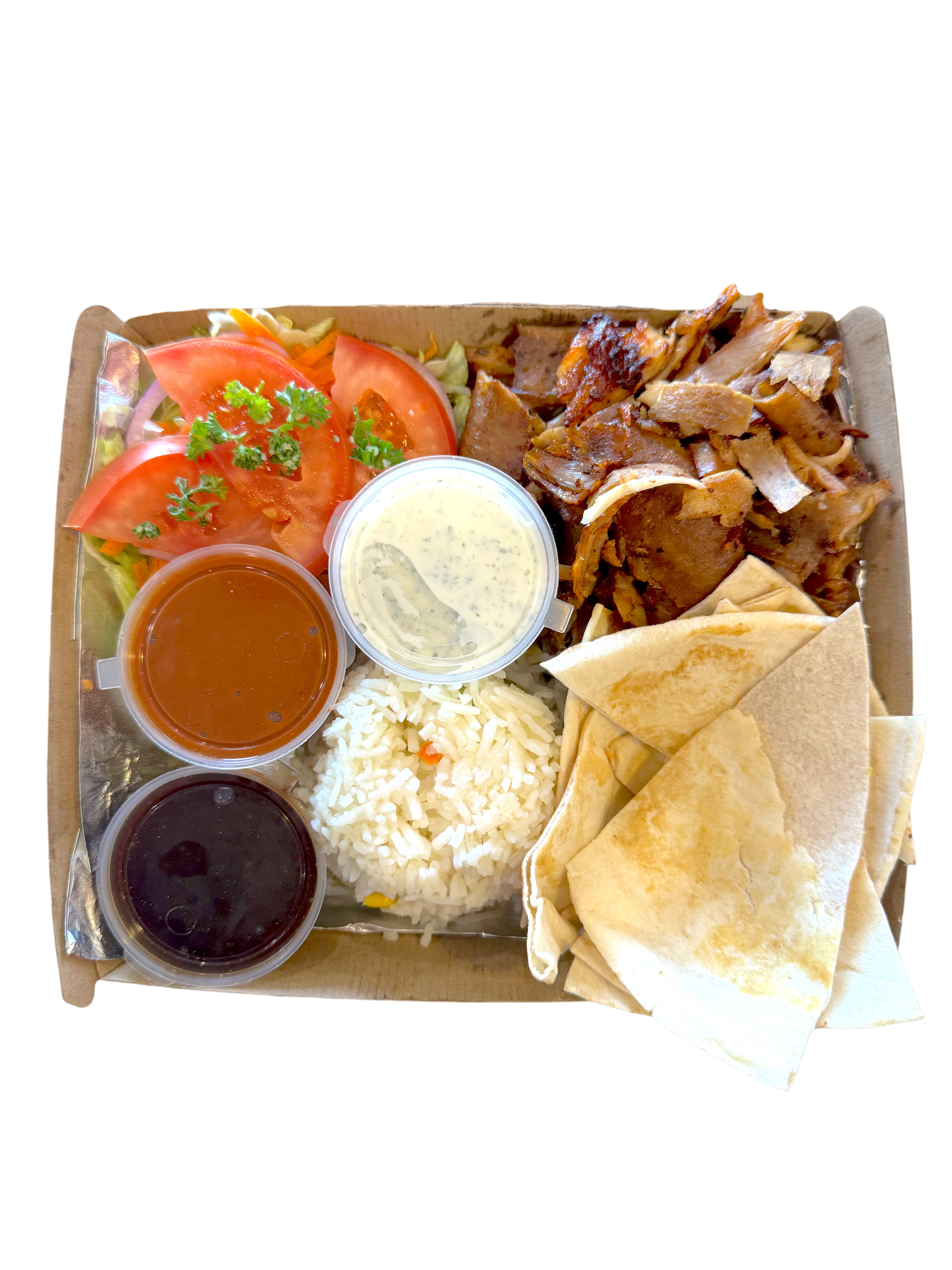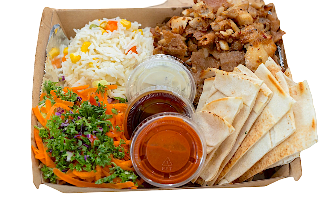 Our Mix Platter is served with Chicken & Lamb Meat, Rice, Lettuce, Tomato, Carrot, Onion, Tabouli, Fresh Bread & up to 3 sauces of your choice Don't Forget: We have a variety of add-ons to suit your taste buds
