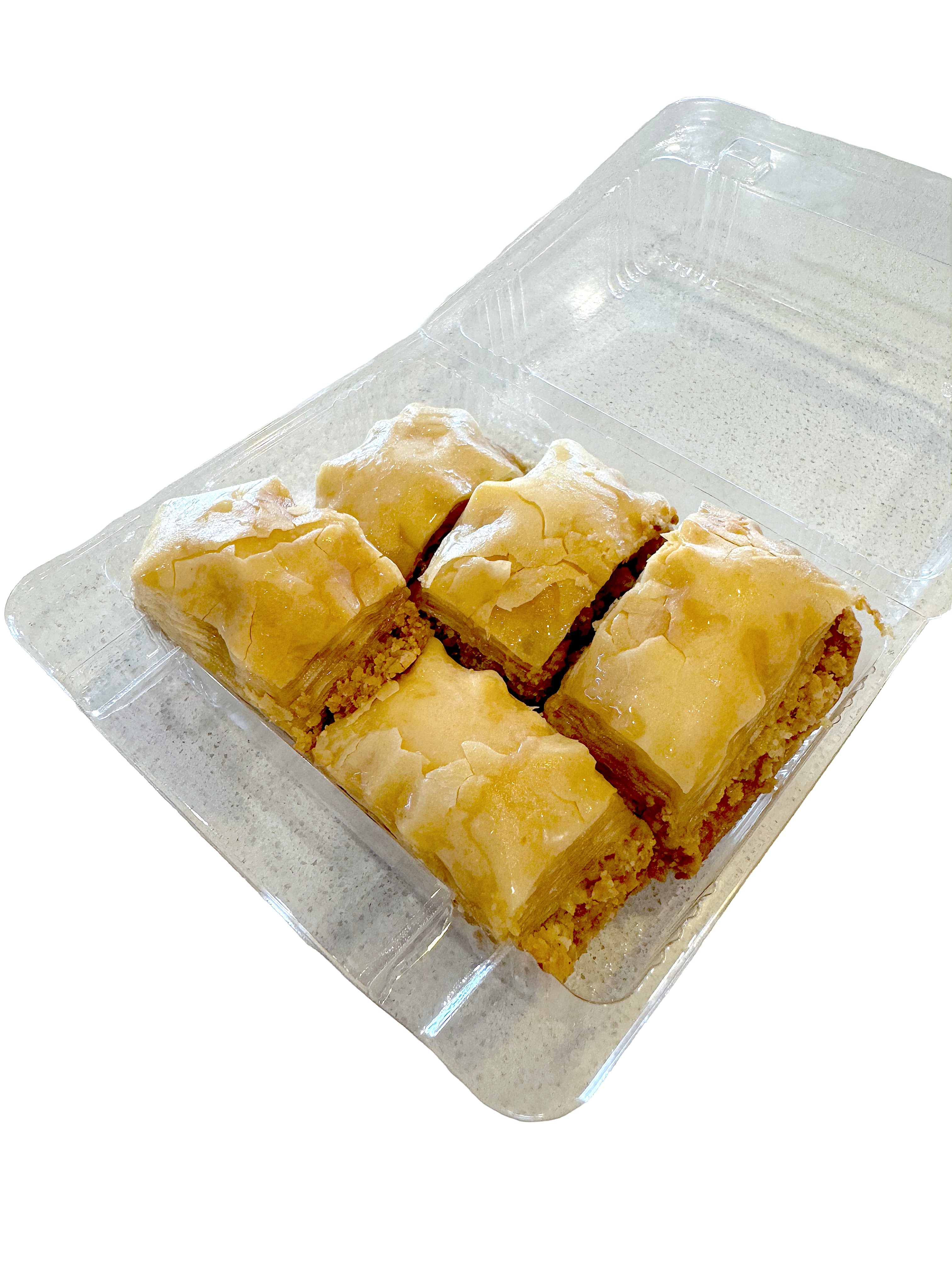 Baklava Pack of 5 Layer upon layers of flaky buttery pastry with crushed cashew nuts soaked in a honey lemon syrup INGREDIENTS: Sugar Syrup, Ghee, Wheat Flour, Starch, Cashew Nuts, Water, Milk, Salt and Filo Pastry