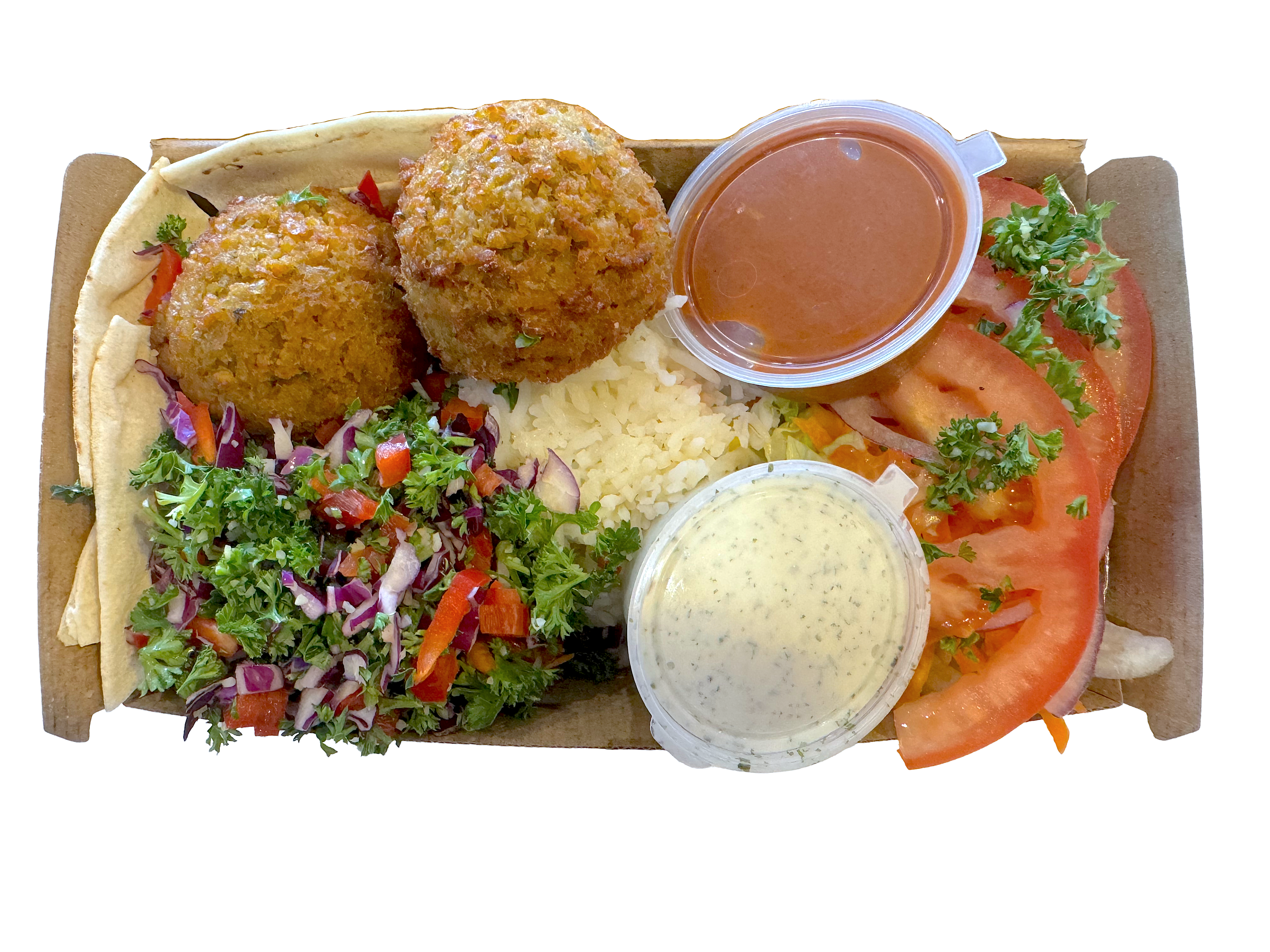 Our Falafels are made in-house with our own recipe! Our Falafel Platter is served with Falafel, Rice, Lettuce, Tomato, Carrot, Onion, Tabouli, Fresh Bread & up to 3 sauces of your choice Don't Forget: We have a variety of add-ons to suit your taste buds